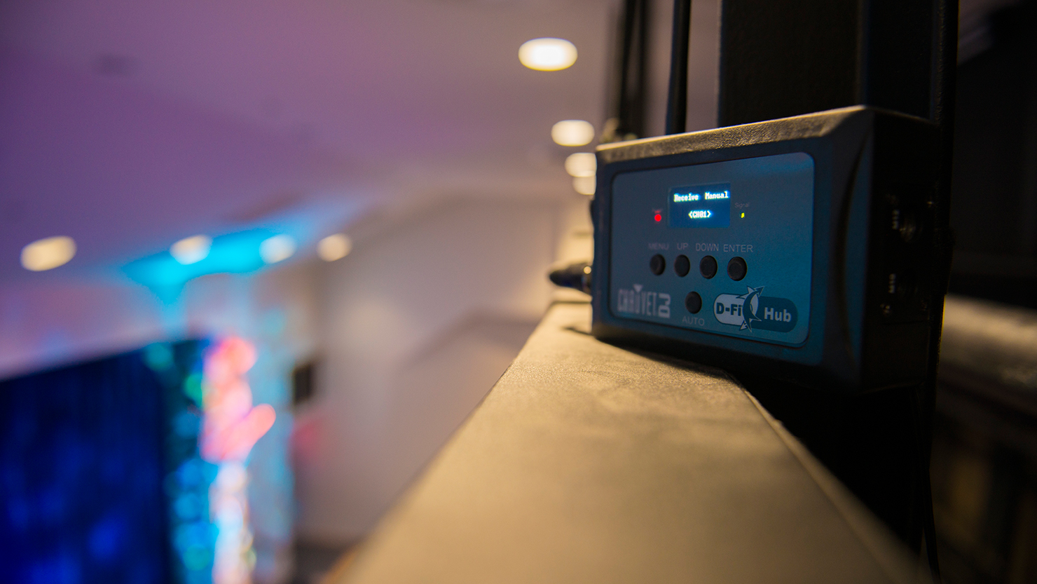 D-Fi Hub is a compact, easy-to-use DMX unit that functions as either a transmitter or receiver. For more stable communication between units, it operates on a 2.4 GHz frequency range and includes an “auto” function which automatically finds the best frequency and syncs the units effortlessly. You can wirelessly synchronize an unlimited number of D-Fi-ready fixtures simultaneously, and operate them using the simple navigation on the OLED digital display.